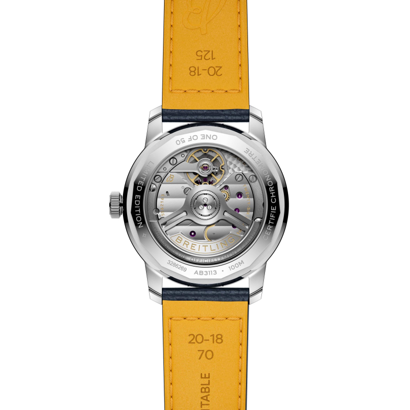 在卓越性能的支撑下,全新腕表延续了该系列的经典设计,同时在细节处融入独具匠心的色彩搭配,实现“焕新皮肤”。表款采用当下再度风靡的38毫米尺寸,完美复刻复古韵味,并适配不同手腕与性别。深邃蓝色表盘呈现细腻拉丝纹理,增添层次感;醒目的黄色秒针与外缘5分钟间隔的黄色点状时标相呼应,3点位置设有泡泡镜日历窗——这些设计在确保读时清晰直观的同时,也成为盘面上的点睛之笔,于复古基调中透出摩登活力。值得一提的是,此种黄蓝配色正是百年灵的品牌标志色。