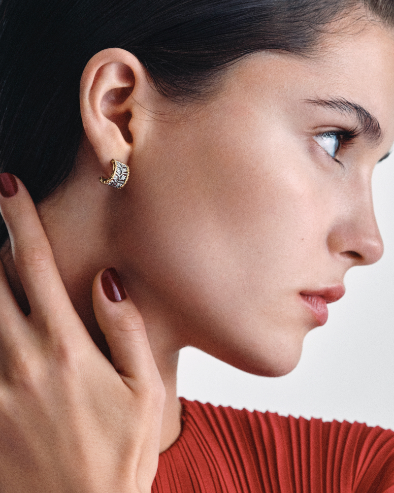 全新珠宝臻作为节庆时光注入璀璨新意。Mosaico系列灵感源自古老的拜占庭马赛克艺术,闪耀钻石以极具艺术感的大胆排布,铺陈出流转光华。此次,Mosaico系列推出多款戒指、耳饰与手镯新作,以模块化几何图案设计,重释马赛克艺术的精致优雅。而Macri系列袖扣则采用品牌标志性“Rigato”平行纹雕刻工艺装饰,以碧玉点缀出灵动色彩层次。Ramage系列环形耳环呈现精巧枝蔓造型,点缀精致钻石,礼赞自然生机与灵韵。Étoilée系列作品以细腻设计捕捉光影流转,诠释该系列独有的优雅意蕴与匠心造诣。Blossoms系列作品则栩栩再现花卉的迷人姿态,为节日庆典增添一抹现代韵致。