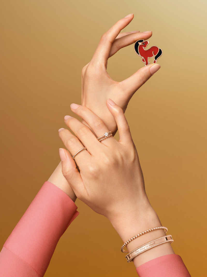 彩灯流转,喜气盈庭。Lucky Animals Horse胸针以欢愉金珠映衬红玉髓与缟玛瑙的浓郁色彩,点亮新岁初启的喜庆氛围。Perlée signature手镯与Perlée单颗钻石戒指以玫瑰金的温润光泽映照新春相聚的温暖时刻。世家自1920年代开始,便将流光溢彩的金珠元素运用于珠宝作品中,金珠圆润饱满的造型,为每一件作品注入了欢欣活力。柔和的金色光影悄然流淌,将欢笑与祝福轻轻凝聚,伴随时光悠然延展。