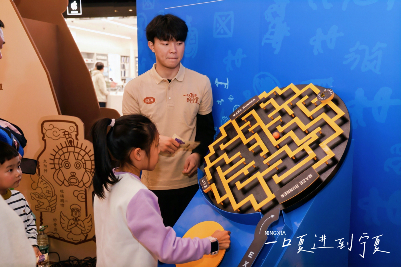 互动区则是年轻群体的 “文化游乐场”。妙音迷宫中,西夏乐器的独特旋律引导参与者探索声音里的宁夏;探秘岩画环节,通过数字技术还原贺兰山太阳神岩画的创作背景,让千年石刻 “开口说话”;镇火鸱吻、IP拉霸机等趣味互动,将西夏文化符号转化为可参与、可体验的游戏。参与者集齐印章即可解锁专属福利,在玩乐中加深对宁夏文化的了解。