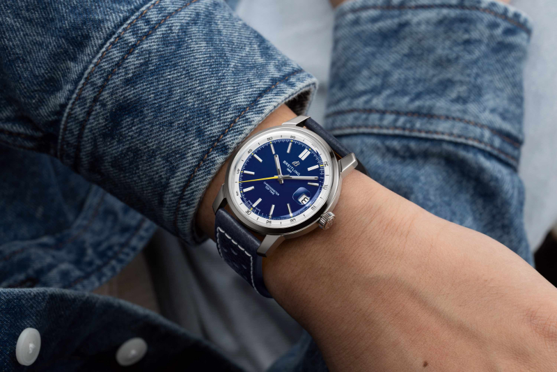 在卓越性能的支撑下,全新腕表延续了该系列的经典设计,同时在细节处融入独具匠心的色彩搭配,实现“焕新皮肤”。表款采用当下再度风靡的38毫米尺寸,完美复刻复古韵味,并适配不同手腕与性别。深邃蓝色表盘呈现细腻拉丝纹理,增添层次感;醒目的黄色秒针与外缘5分钟间隔的黄色点状时标相呼应,3点位置设有泡泡镜日历窗——这些设计在确保读时清晰直观的同时,也成为盘面上的点睛之笔,于复古基调中透出摩登活力。值得一提的是,此种黄蓝配色正是百年灵的品牌标志色。