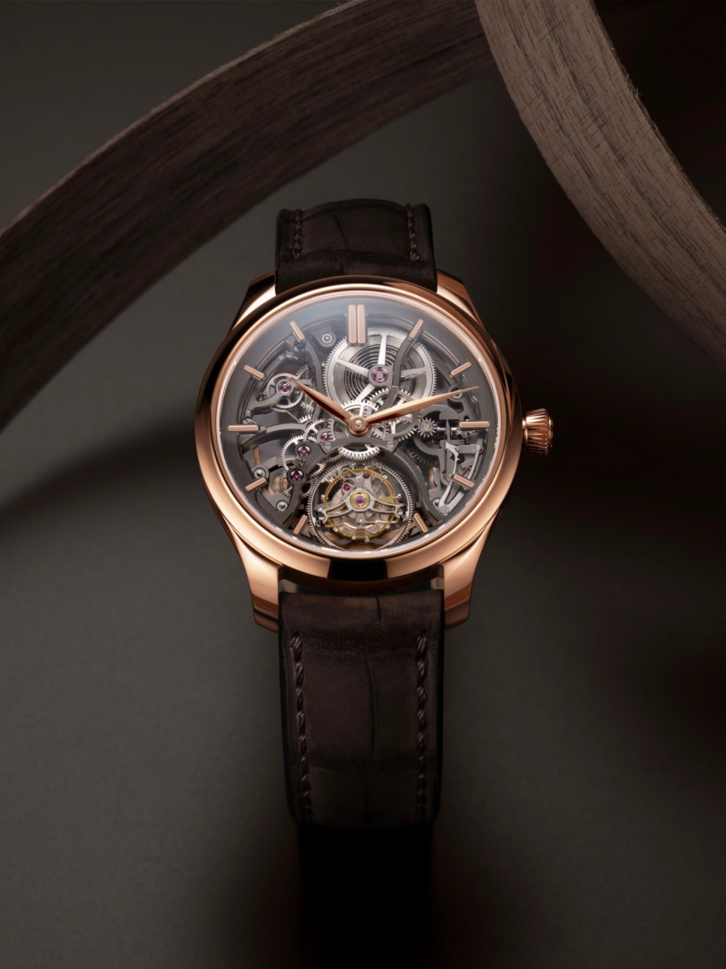 对H. Moser & Cie. 亨利慕时而言,极简主义不仅是一种风格,更是一种理念——一种通过“去除”来“呈现”的思考方式。旨在摒弃所有冗余元素,只为呈现机械结构的纯粹之美。极简主义是品牌的标志性特征,而勇创者系列陀飞轮镂空腕表(Endeavour Tourbillon Skeleton),则将这一理念推向极致:一款全镂空腕表,在设计时仅保留了最核心的部件。时间在配备双游丝的一分钟飞行陀飞轮的律动中自由流转,陀飞轮仿佛无重力般悬浮于其中。勇创者系列陀飞轮镂空腕表采用40毫米直径的5N红金表壳,尽显优雅风范,堪称真正的时尚宣言。