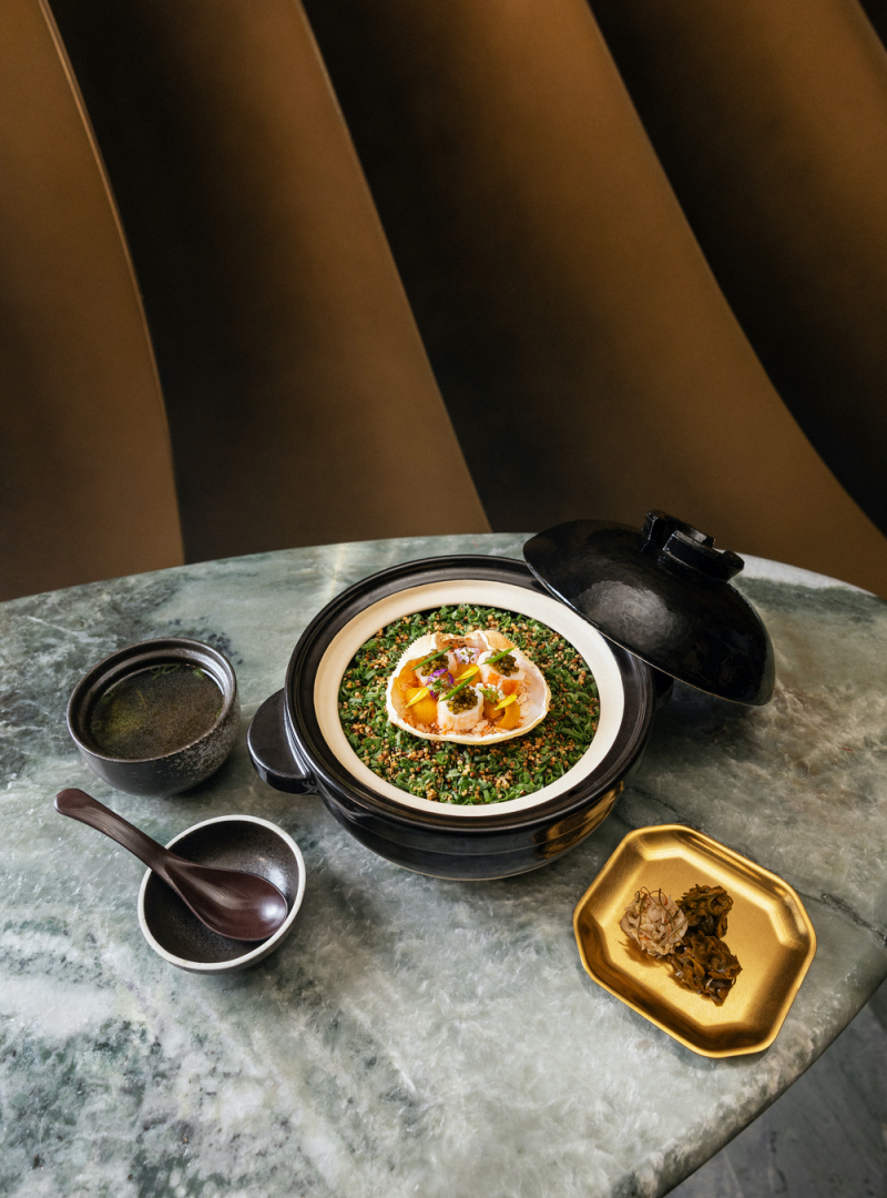 作为晚宴亮点,松叶蟹釜饭將经典暖心滋味升华,选用新鲜拆取的雪蟹肉,融入韩国传统发酵技法启发的元素,并以蟹壳盛载呈现,尽显视觉张力。配以清雅淡丽的海苔汤及自家制韩式小菜,形成鲜明对比,为味蕾带来清新感觉。