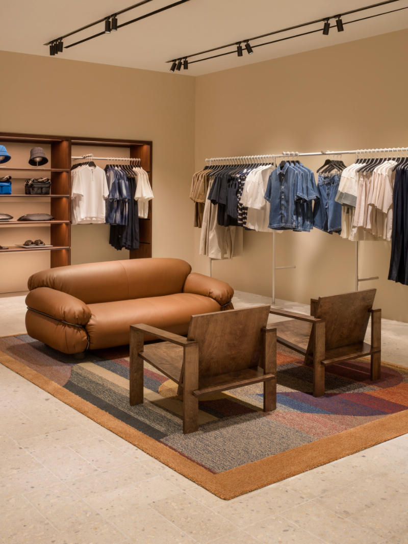 门店空间陈设巧妙平衡复古格调与现代美学。柔软的 Alky 扶手椅(来自 Giancarlo Piretti)与经典的 Sesann 皮革沙发(来自 Tacchini)以饱满的雕塑感造型奠定空间基调,与 COS 新季系列的流动廓形和解构剪裁相呼应。镜面铬钢边几(来自 Six the Residence)为空间注入现代锋芒,试衣间内手工软垫座椅(来自 NOR11)与深色木纹饰面形成视觉张力。此外,店铺内点缀着有机形态的台灯(来自 Helle Mardahl),糖果色折射跃动灵性光影,为空间注入温暖活力。