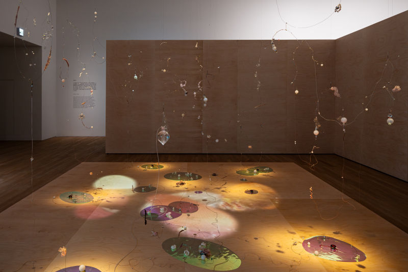 陆扬、邵纯和张移北将在首章展览中呈献大馆当代美术馆委约的作品。陆扬的线上游戏《器世界骑士太空对战》(2022/2025)让玩家在幻想世界中驰骋。邵纯的全新装置《蜜珠》(2025),以地面影像投影,结合旋转悬垂的元素,触碰性别议题。张移北则在展厅地面的排气口上,设置形似蘑菇与花朵的新作《清晰,金黄,呼唤着》(2025)。